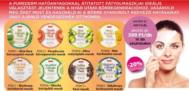 A PureDerm hatóanyagokkal átitatott fátyolmaszkjai ideális választást jelentenek a nyár utáni bőrregenerációhoz. Az akció keretében 10 darab vásárlásakor darabonként 399. -Ft az ára, eredeti 499. -Ft-os ár helyett.