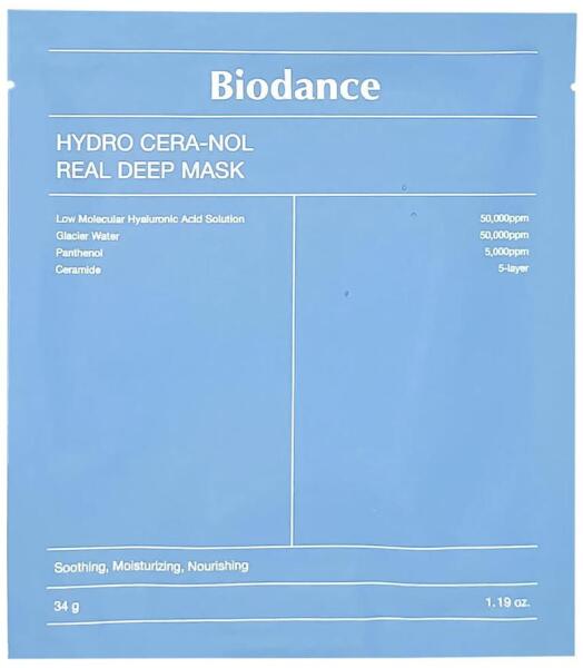A Biodance Hydro Cera-Nol Real Deep Mask egy koncentrált esszenciával átitatott olvadó maszk. Intenzíven táplálja és hidratálja, gyógyítja a száraz és sérült bőrt, csökkenti az érzékenységet és erősíti a védő hidrolipid barriert. Megszünteti a hámlást, puhítja az érdes és időjárás viszontagságait, beindítja a belső regenerációs folyamatokat és enyhíti az irritációt. Kiegyenlíti a tónust, megszabadul a fakóságtól, csökkenti a hidratálás hiánya által okozott ráncok kifejeződését. Csökkenti a bőr hőmérsékletét ~5°C-kal, megszünteti a kellemetlen érzést és az égő érzést. Revitalizál 3-4 óra alatt : a hidrogél alap szállítja az összes hatóanyagot és átlátszóvá válik. A termék éjszaka is használható: a maszk szilárdan rögzül az arcon, nem csúszik le, nem hagy nyomot a párnán. Főbb hatóanyagok :